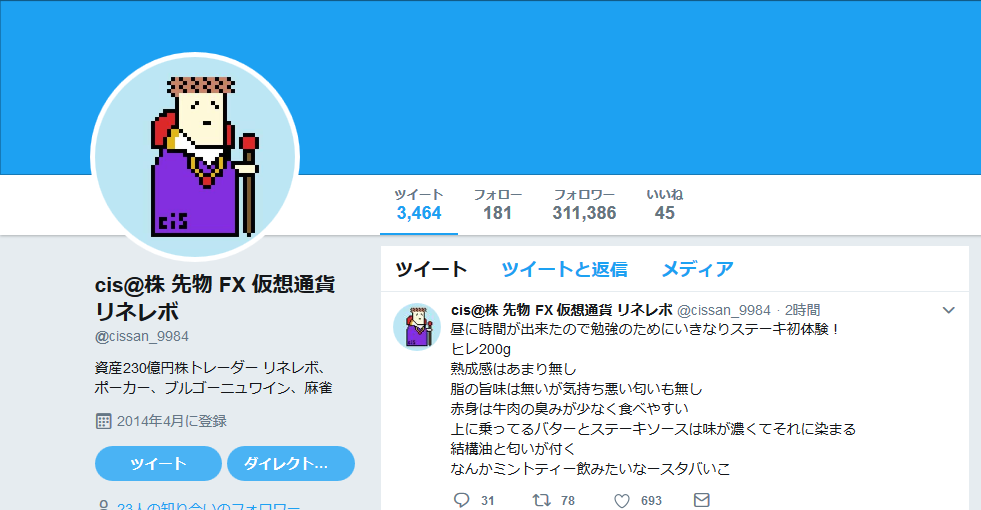 投資関係のツイートだけではなく、人生観や世間に対する意見などのツイートもありますので、楽しく見ることができます。
